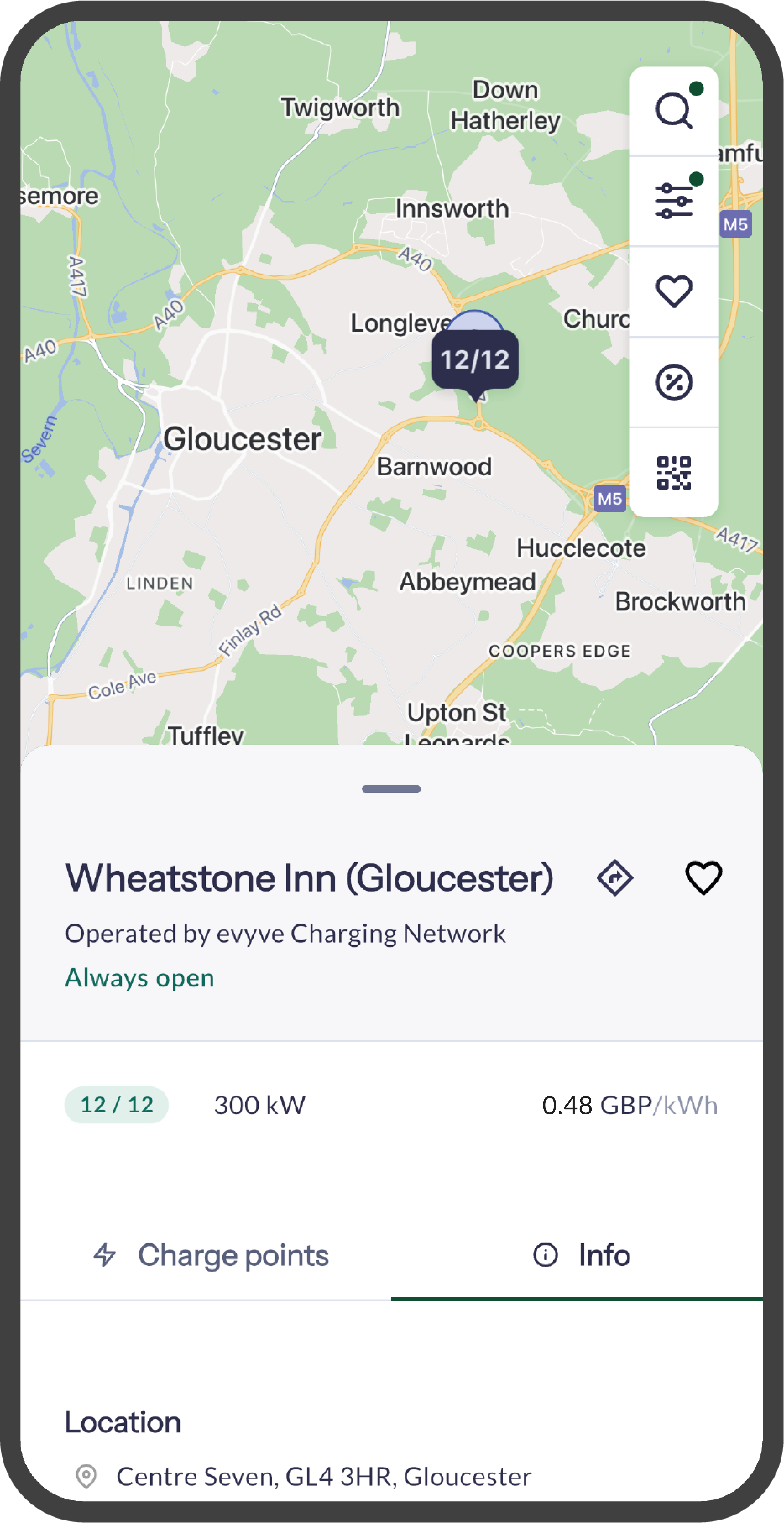 Use our location finder tool here to view your nearest evyve charge point. Alternatively, download the evyve app and use our map view to locate your nearest charge point location.